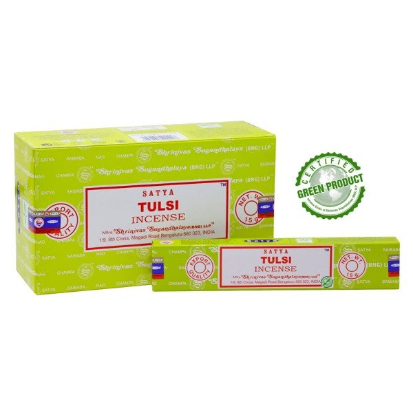Los sahumerios Tulsi Satya están elaborados con la planta sagrada tulsi (albahaca india), conocida por sus propiedades purificadoras y espirituales.