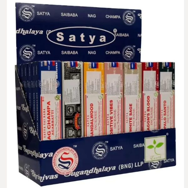 El Box contiene 42 Satya x 15 g. Fragancias: Nag Champa, Super Hit, Sandalwood, Positive Vibes, Palo Santo, Dragon Blood, White Sage. La caja sirve como exhibidor de los productos